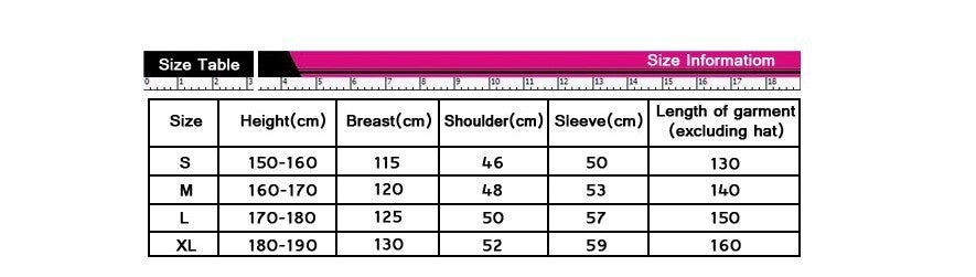 Size: S size recommended height 145-158cm, M size recommended height 159-168cm, L size recommended height 168-178cm, XL size recommended height 179-188cm, XS/100,S/110,M/120,L/130,XL/140